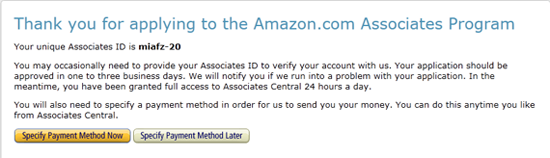 mazon จะบอกว่าเราสมัครเรียบร้อยแล้ว ทีนี้ให้เรากดที่ Specify Payment Method Now เพื่อยืนยันวิธีรับเงินครับ